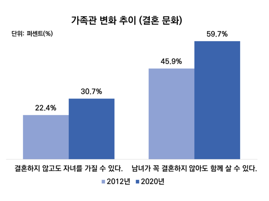 또 '2020년 사회조사 결과'17는 국민의 약 30%가 ‘결혼하지 않고도 자녀를 가질 수 있다’고 답했고, ‘남녀가 꼭 결혼하지 않아도 함께 살 수 있다’는 문항에는 60% 가까이 동의했다. 8년 전인 2012년의 응답과는 확연히 달라진 인식을 볼 수 있다.