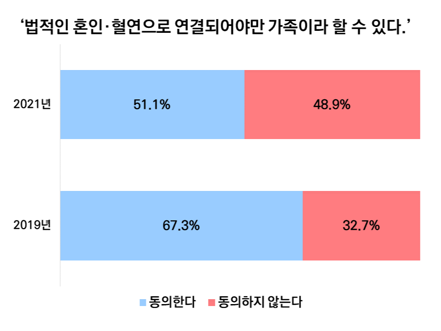 그럼 현재 가족에 대한 국민인식은 어떨까. 2021년 '가족 다양성에 대한 국민인식 조사'16에 따르면 ‘법적인 혼인·혈연으로 연결돼야만 가족이다’ 라는 항목에 51.1%가 동의했다. 2년 전인 2019년엔 동일 항목의 동의가 67.3%로, 혼인이나 혈연 만을 가족의 조건으로 여긴 국민이 지금보다 16.2% 포인트나 많았다.