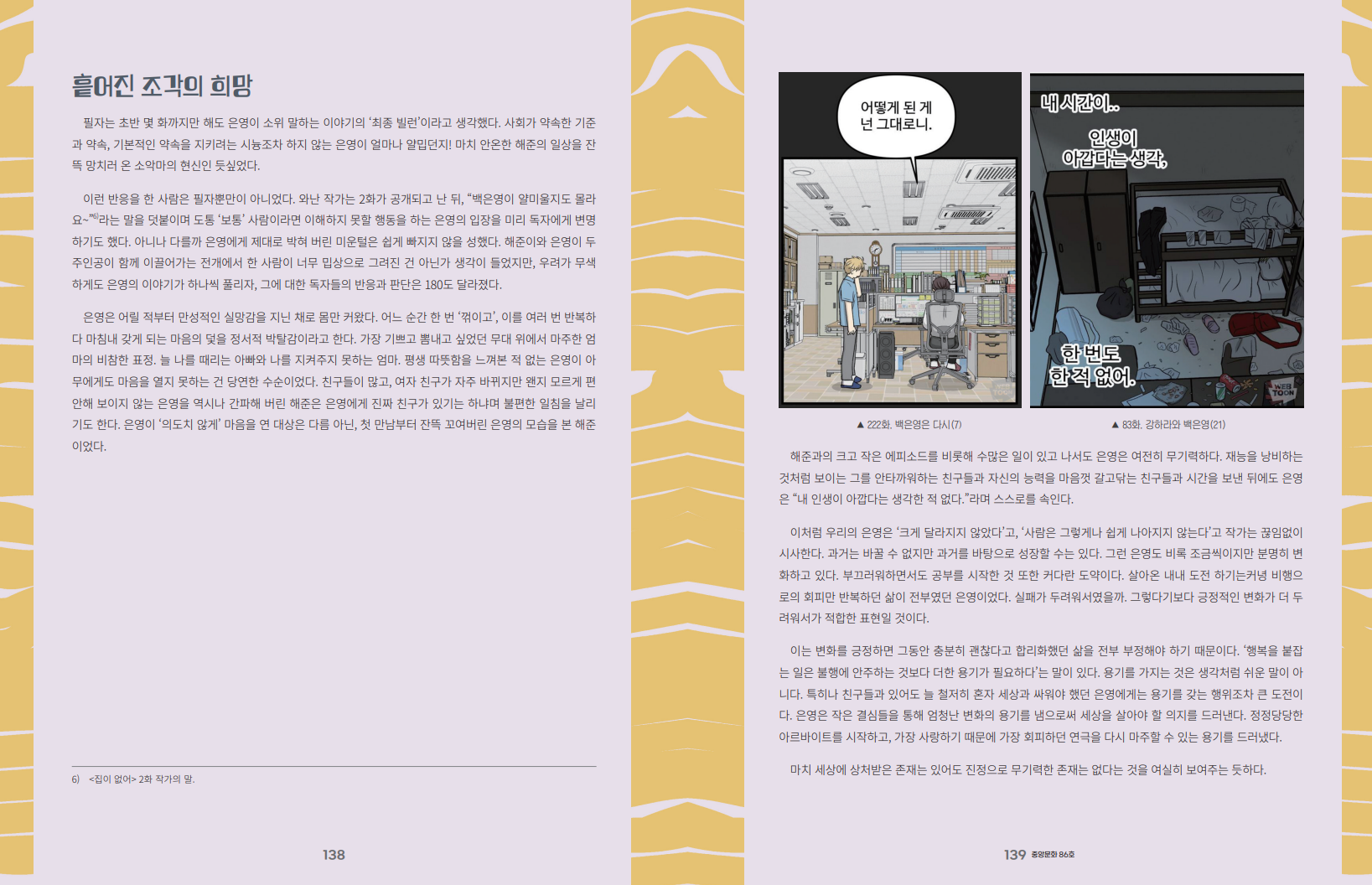 이처럼 우리의 은영은 ‘크게 달라지지 않았다’고, ‘사람은 그렇게나 쉽게 나아지지 않는다’고 작가는 끊임없이 시사한다. 과거는 바꿀 수 없지만 과거를 바탕으로 성장할 수는 있다. 그런 은영도 비록 조금씩이지만 분명히 변화하고 있다. 부끄러워하면서도 공부를 시작한 것 또한 커다란 도약이다. 살아온 내내 도전 하기는커녕 비행으로의 회피만 반복하던 삶이 전부였던 은영이었다. 실패가 두려워서였을까. 그렇다기보다 긍정적인 변화가 더 두 려워서가 적합한 표현일 것이다.