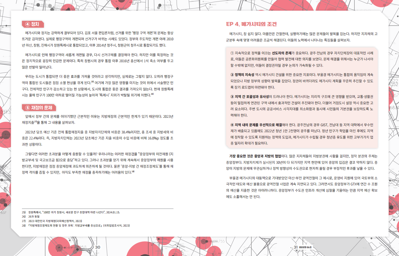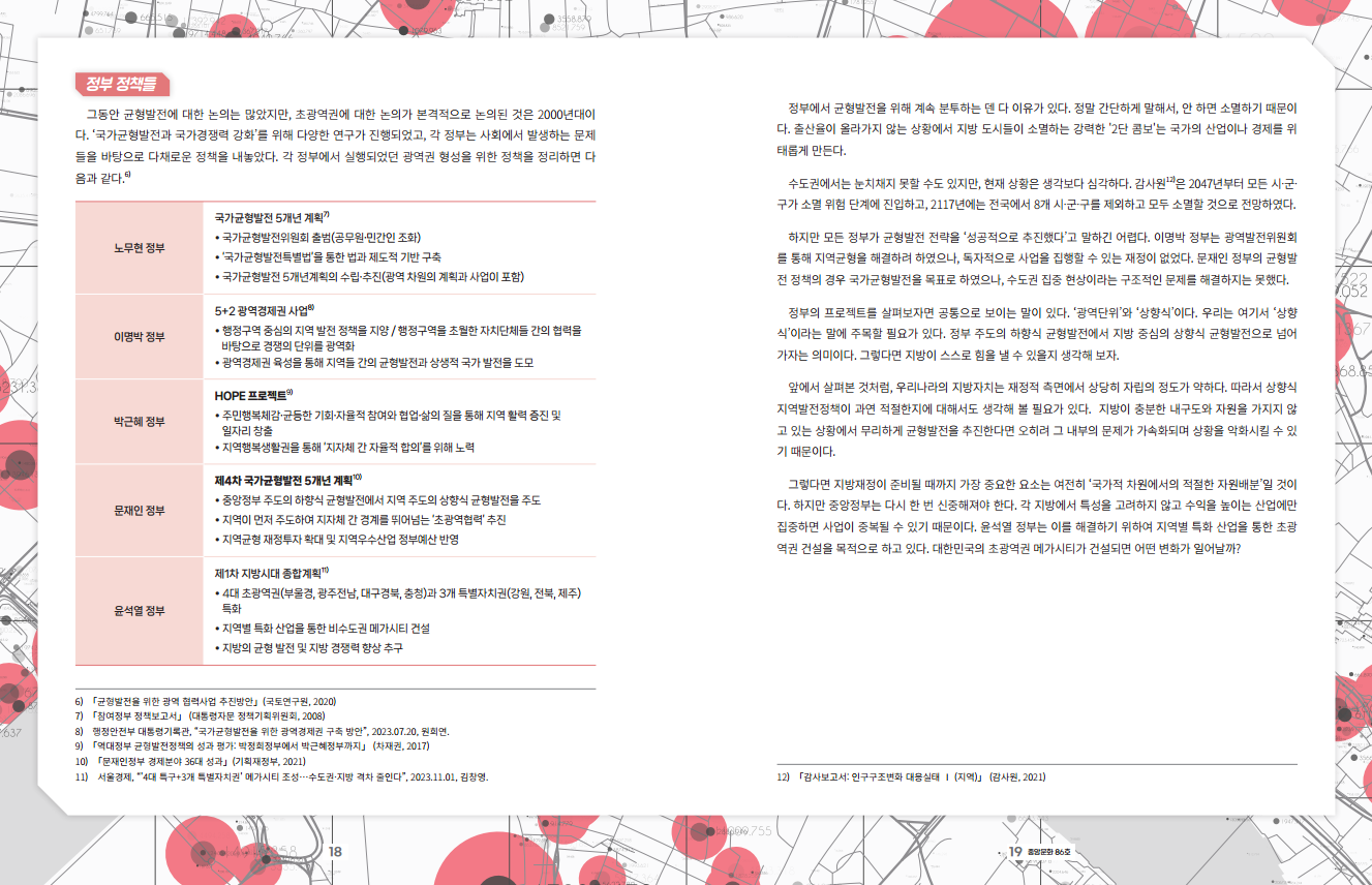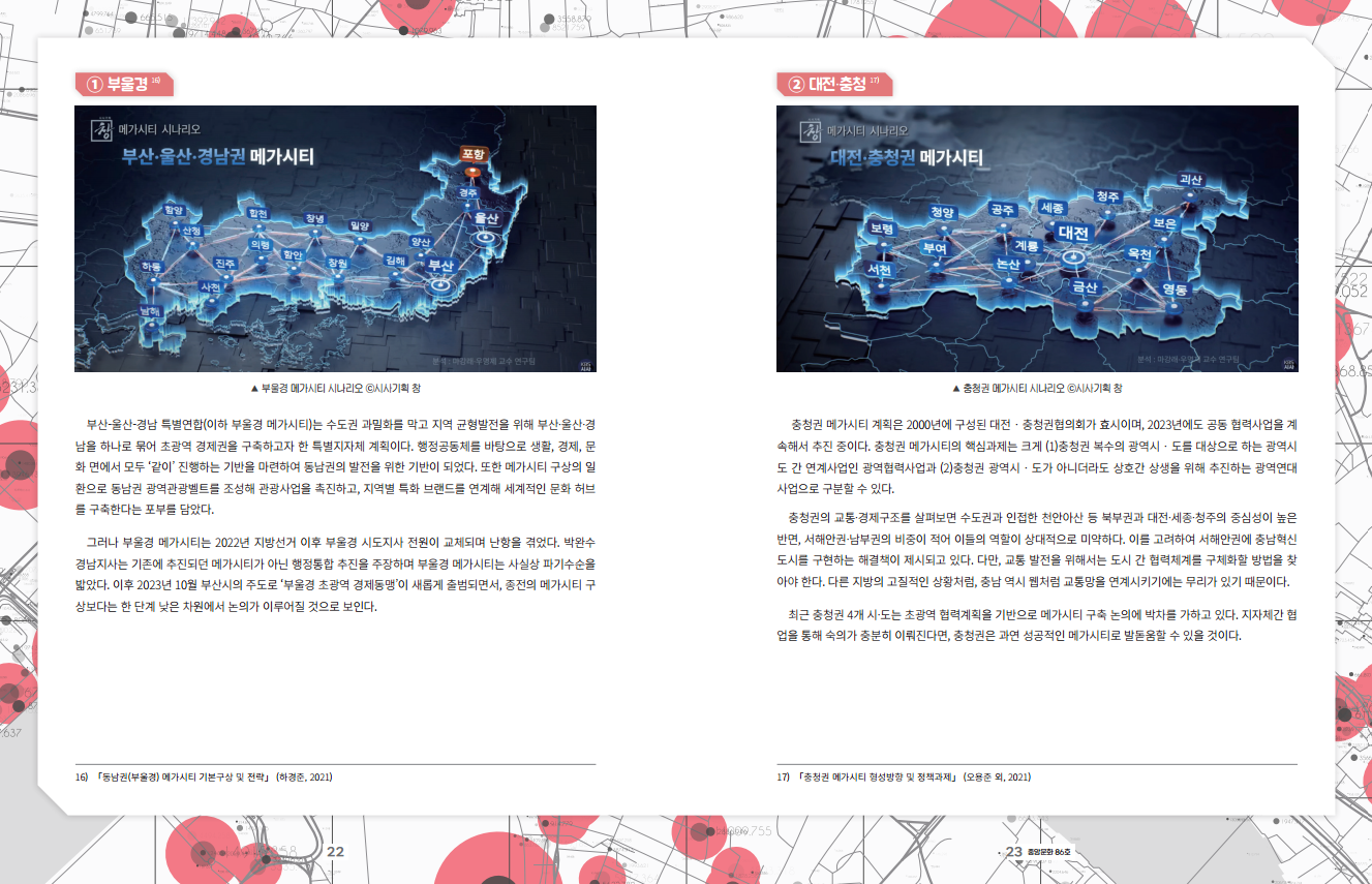 한국을 ‘서울공화국’이라고 부르는 것에는 이견이 없다. 우리나라는 경제 발전을 거치며 대도시, 특히 수도권에 집중된 발전형태를 가지게 되었다. 과도한 수도권 쏠림을 해결하기 위해 문민정부2 이래로 수많은 논의가 있었지만, 크게 이렇다 할 진전은 없었다. 그 이후에도 몇 번 더 논의가 있다가 2020년대에 들어서서야 수도권 일극체제를 극복할 ‘메가시티’에 마침내 시선이 집중됐다.