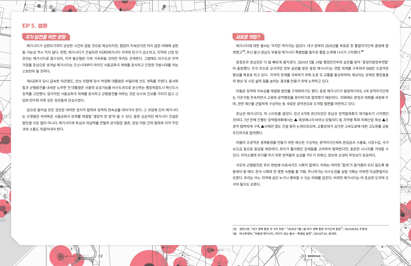 국토의 균형발전은 우리 헌법에 아로새겨진 사회적 합의다. 이제는 이러한 ‘합의’가 물거품이 되지 않도록 행동해야 할 때다. 한국 사회의 한 맺힌 숙원을 풀 기회, 무너져가는 비수도권을 살릴 기회는 어쩌면 지금뿐일지도 모른다. 우리는 어느 지역에 살던 누구나 행복할 수 있는 미래를 꿈꾼다. 어쩌면 메가시티는 이 중요한 도약의 초석이 될지도 모른다.
