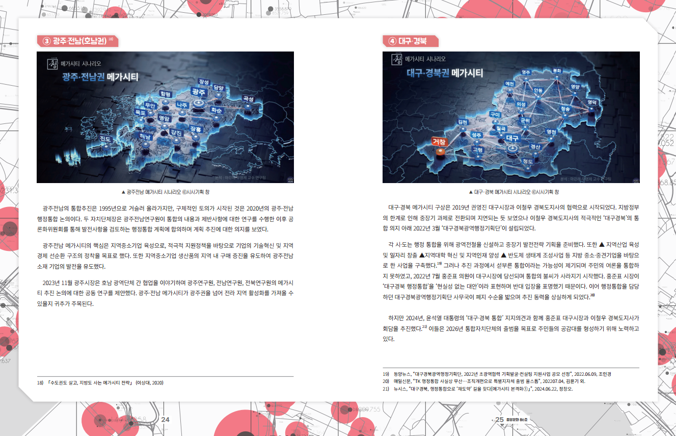 메가시티에 대한 불씨는 작지만 꺼지지는 않았다. 대구·경북이 2026년을 목표로 한 통합자치단체 출범에 합의했고,29 부산·울산·경남도 부울경 메가시티 특별법을 필두로 통합 논의에 나서기 시작했다.30