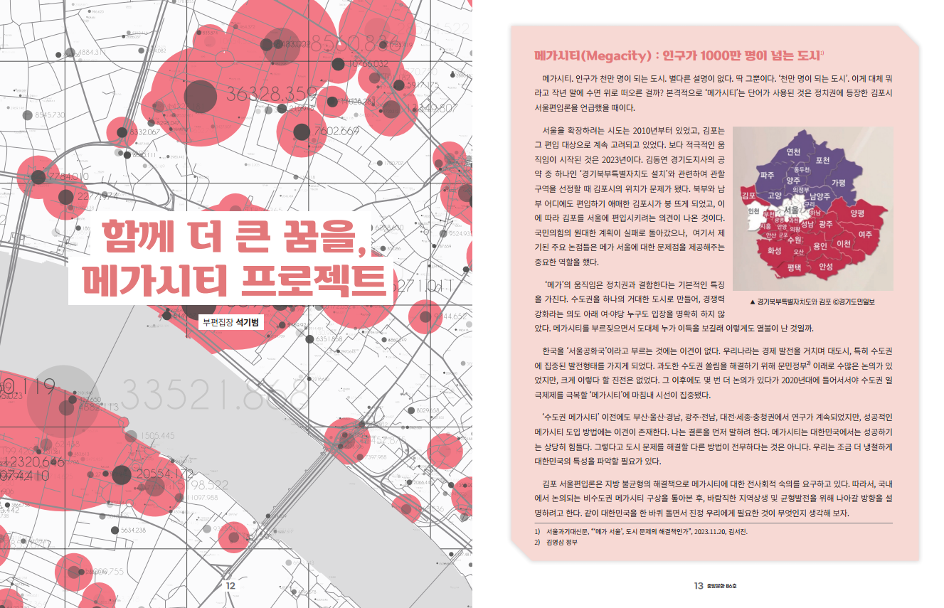 - 서울과기대신문, “‘메가 서울’, 도시 문제의 해결책인가”, 2023.11.20, 김서진. [본문으로]