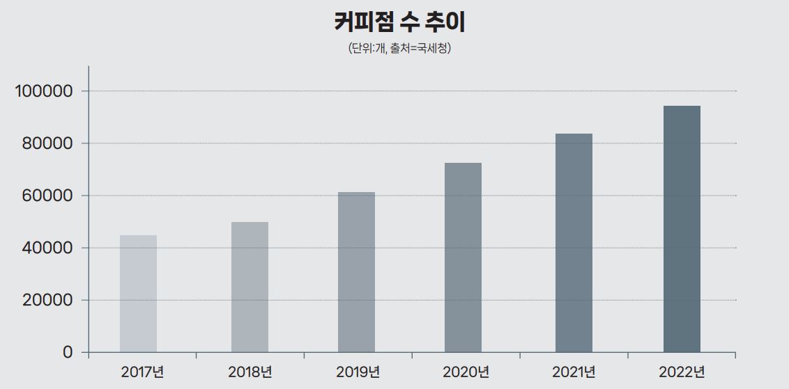 카페는 길거리의 대장이다. 점차 카페의 수가 늘어나면서 시장경제 내에 카페 레드오션(Red Ocean)이 조성됐다. 2021년 8만여 개로 추산되던 국내 카페 점포 수는 2023년 10만 개에 근접했다. 이는 20.3%가 증가한 추세다. 특히 상대적으로 싼 가격에 음료를 제공하는 저가 커피 프랜차이즈 매장이 날이 갈수록 영향력을 확대하고 있다.