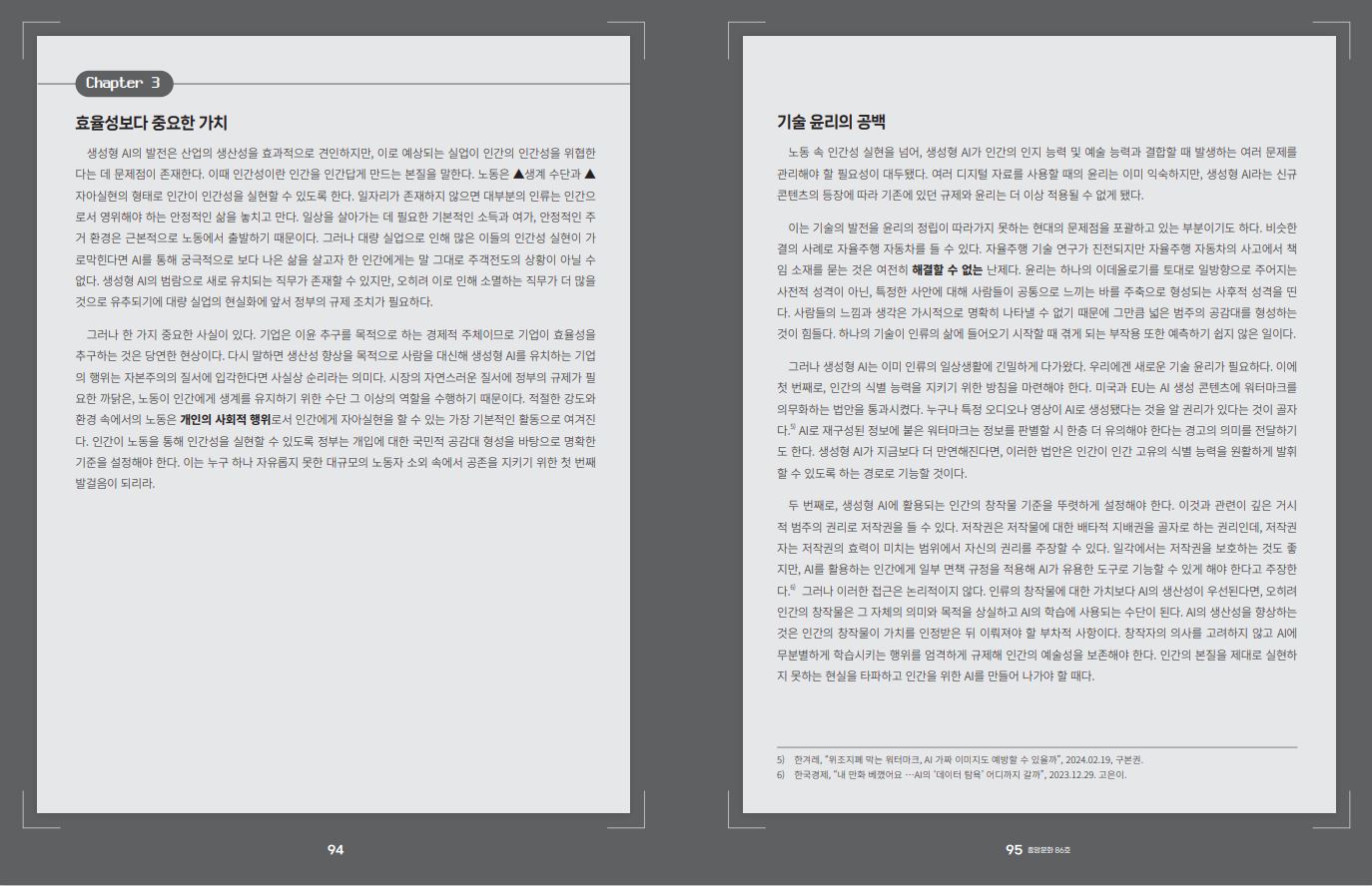 그러나 한 가지 중요한 사실이 있다. 기업은 이윤 추구를 목적으로 하는 경제적 주체이므로 기업이 효율성을 추구하는 것은 당연한 현상이다. 다시 말하면 생산성 향상을 목적으로 사람을 대신해 생성형 AI를 유치하는 기업의 행위는 자본주의의 질서에 입각한다면 사실상 순리라는 의미다. 시장의 자연스러운 질서에 정부의 규제가 필요한 까닭은, 노동이 인간에게 생계를 유지하기 위한 수단 그 이상의 역할을 수행하기 때문이다. 적절한 강도와 환경 속에서의 노동은 개인의 사회적 행위로서 인간에게 자아실현을 할 수 있는 가장 기본적인 활동으로 여겨진다. 인간이 노동을 통해 인간성을 실현할 수 있도록 정부는 개입에 대한 국민적 공감대 형성을 바탕으로 명확한 기준을 설정해야 한다. 이는 누구 하나 자유롭지 못한 대규모의 노동자 소외 속에서 공존을 지키기 위한 첫 번째 발걸음이 되리라.