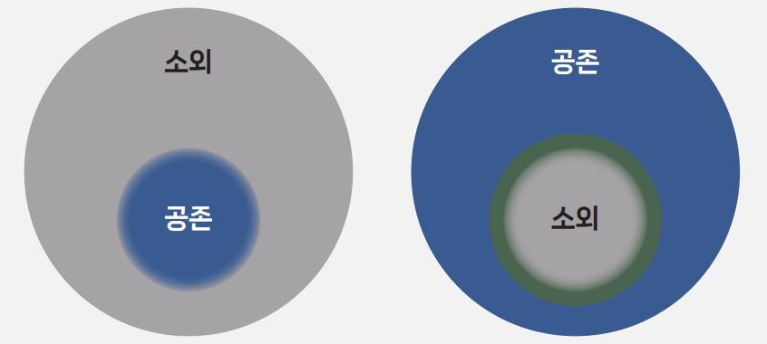 첫 번째로, 소외 속 공존은 범세계적 소외 속에서 나타나는 공존을 말한다. 소외가 범세계적 특징을 갖는다는 것은 국적, 연령, 성별, 경제력, 학력 등 개인을 타인으로부터 구분하는 여러 요소에 상관없이 누구나 소외의 대상이 될 수 있다는 의미다. 두 번째로, 공존 속 소외는 불특정 다수의 공존 속에서 도드라지는 소외를 말한다. 소외의 개념이 상대적으로 작게 느껴질 수는 있지만, 대상이 되는 사람들에게는 무엇보다 큰 영향력을 행사한다는 점에 특이성을 지닌다. 사회에서 이 두 가지의 양상은 서로 혼합되거나 꼬리에 꼬리를 무는 다양한 모습을 보인다. 그렇다면 소외와 공존이 우리의 일상에 어떤 모습으로 스며들어 있는지 알아보자.