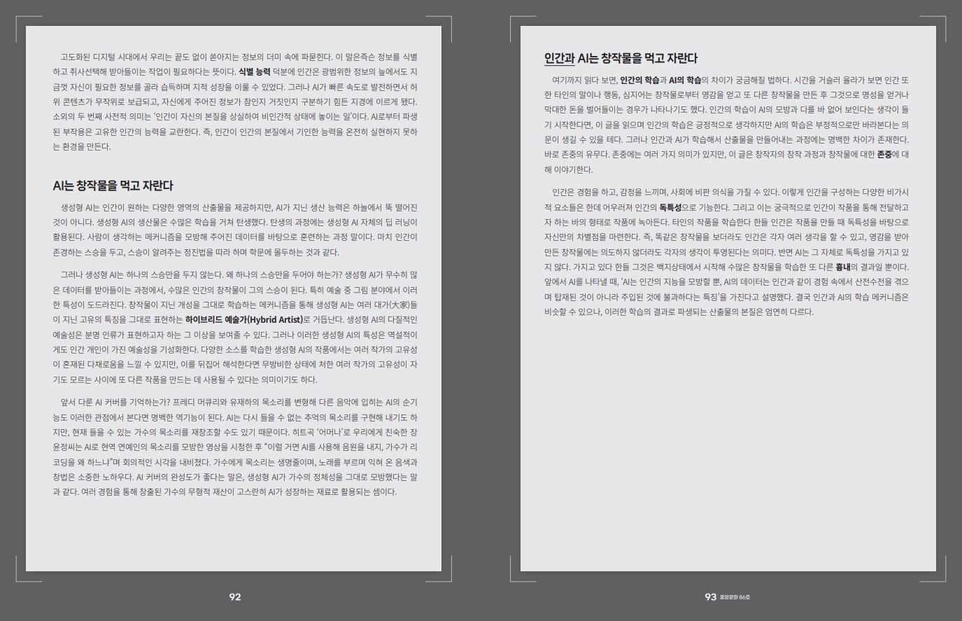 생성형 AI는 인간이 원하는 다양한 영역의 산출물을 제공하지만, AI가 지닌 생산 능력은 하늘에서 뚝 떨어진 것이 아니다. 생성형 AI의 생산물은 수많은 학습을 거쳐 탄생했다. 탄생의 과정에는 생성형 AI 자체의 딥 러닝이 활용된다. 사람이 생각하는 메커니즘을 모방해 주어진 데이터를 바탕으로 훈련하는 과정 말이다. 마치 인간이 존경하는 스승을 두고, 스승이 알려주는 정진법을 따라 하며 학문에 몰두하는 것과 같다.