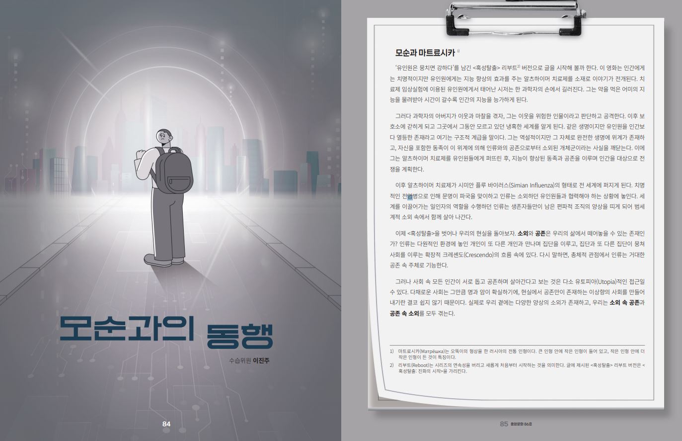 그럼에도 우리는 상생을 도모할 수 있는 존재이며, 상생을 도모하고자 노력하는 존재다. 공존(公存)의 첫 번째 의미는 ‘두 가지 이상의 사물이나 현상이 함께 존재하는 일’이지만, 두 번째 의미는 ‘서로 도와서 함께 존재하는 일’이다. 단순히 한 공간에 함께 머물러 있는 병존(竝存)과는 다르게 서로서로 북돋고 잘살 방안을 꾀하는 것. 그것이 필연적인 소외를 겪는 우리가 서로에게 할 수 있는 가장 큰 공감이지 않을까.