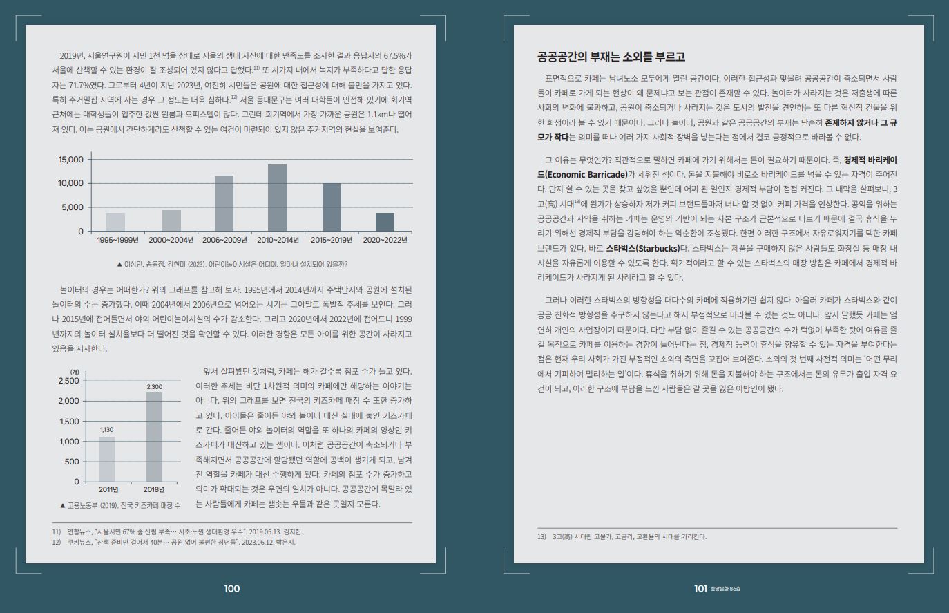 표면적으로 카페는 남녀노소 모두에게 열린 공간이다. 이러한 접근성과 맞물려 공공공간이 축소되면서 사람들이 카페로 가게 되는 현상이 왜 문제냐고 보는 관점이 존재할 수 있다. 놀이터가 사라지는 것은 저출생에 따른 사회의 변화에 불과하고, 공원이 축소되거나 사라지는 것은 도시의 발전을 견인하는 또 다른 혁신적 건물을 위한 희생이라 볼 수 있기 때문이다. 그러나 놀이터, 공원과 같은 공공공간의 부재는 단순히 존재하지 않거나 그 규모가 작다는 의미를 떠나 여러 가지 사회적 장벽을 낳는다는 점에서 결코 긍정적으로 바라볼 수 없다.