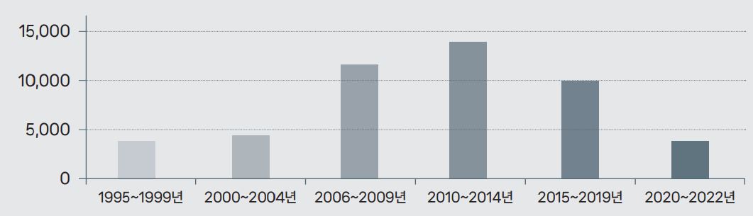 놀이터의 경우는 어떠한가? 위의 그래프를 참고해 보자. 1995년에서 2014년까지 주택단지와 공원에 설치된 놀이터의 수는 증가했다. 이때 2004년에서 2006년으로 넘어오는 시기는 그야말로 폭발적 추세를 보인다. 그러나 2015년에 접어들면서 야외 어린이놀이시설의 수가 감소한다. 그리고 2020년에서 2022년에 접어드니 1999년까지의 놀이터 설치율보다 더 떨어진 것을 확인할 수 있다. 이러한 경향은 모든 아이를 위한 공간이 사라지고 있음을 시사한다.