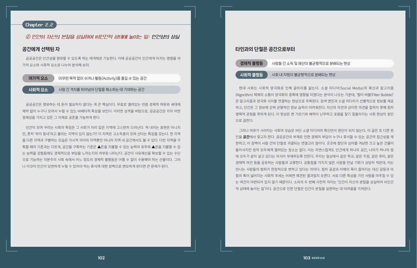 그러나 여유가 사라지는 사회의 모습은 비단 소셜 미디어의 확산만이 원인이 되지 않는다. 이 글은 또 다른 원인을 공간에서 찾고자 한다. 공공공간의 부재로 인한 경제적 부담이 누구나 휴식할 수 있는 공간의 접근성을 제한하고, 이 장벽이 사람 간의 단절로 귀결되는 연결고리 말이다. 곳곳에 첨단과 심미를 겨냥한 크고 높은 건물이 들어서지만 정작 모두에게 열려있는 장소는 없다. 이는 자연스럽게도 인간에게 하나의 공간, 나아가 하나의 땅에 모두가 같이 살고 있다는 의식이 부재하도록 만든다. 우리는 일상에서 같은 학교, 같은 직장, 같은 취미, 같은 경제적 여건 등을 공유하는 사람들과 교류한다. 공통점을 가지지 않은 사람을 만날 기회가 상당히 적은데, 이는 만나는 사람들의 범위가 한정적으로 변하고 있다는 의미다. 점차 공감과 이해의 폭이 좁아지는 대신 갈등과 마찰의 폭이 넓어지는 사회적 추세는 어쩌면 예견된 결과일지 모른다. 서로 다른 특성을 가진 사람을 마주칠 수 있는 여건이 마련되어 있지 않기 때문이다. 소외의 두 번째 사전적 의미는 ‘인간이 자신의 본질을 상실하여 비인간적 상태에 놓이는 일’이다. 공간으로 인한 단절은 인간이 본질을 실현하는 데 어려움을 가져온다.