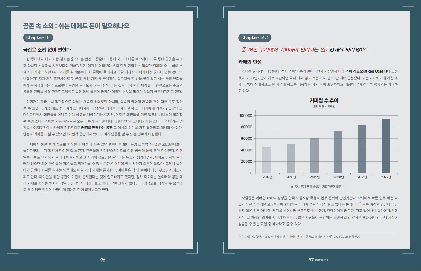 사람들은 이러한 카페의 성장을 한국 노동시장 특유의 업무 문화와 관련짓는다. 사회에서 빠른 업무 해결 속도와 높은 집중력을 요구하기에 현대인들의 커피 섭취가 점점 늘고 있다는 분석이다.7 물론 이러한 접근이 타당하지 않은 것은 아니다. 커피를 생명수라 부르기도 하는 만큼, 현대인에게 커피란 ‘자고 일어나니 돌아온 일상의 시작’ 그 이상의 의미를 지니기 때문이다. 많은 사람들이 공감하는 보편적 삶의 양식은 포화 상태인 카페 시장이 성공할 수 있는 요인 중 하나라고 볼 수 있다.