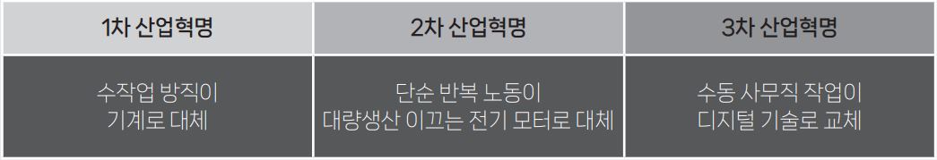 이후 1914년, 전기 에너지를 바탕으로 한 생산방식이 나타나면서 기술의 진보는 더욱 가속화됐다. 소비재 산업으로 분류할 수 있는 경공업에서 큰 부가가치를 생산할 수 있는 중화학 공업으로 산업 패러다임이 바뀌고, 대량 생산을 통해 원가를 절감할 수 있게 되면서 생산성이 매우 증가했다. 이러한 흐름은 컴퓨터와 인터넷을 기반으로 하는 지식과 정보의 혁명으로 이어졌다. 인간의 노동력에서 기계의 만연화, 전기 기술을 결합한 컨베이어 벨트에서 IT 기술을 활용한 공장 자동화에 이르기까지. 쉴 새 없이 거친 변화를 거쳐 온 산업 패러다임은 인류의 삶의 질을 개선했다.
