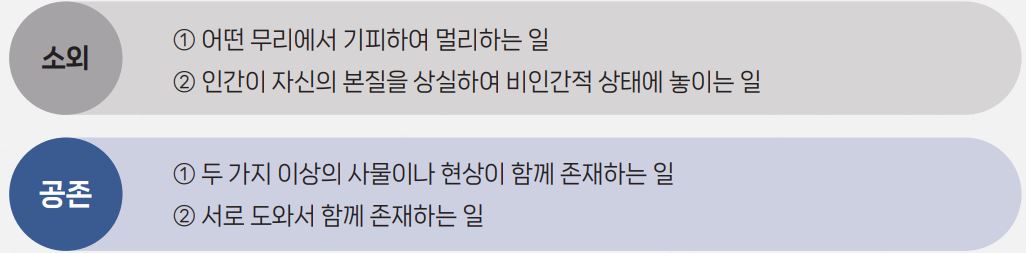 그러나 사회 속 모든 인간이 서로 돕고 공존하며 살아간다고 보는 것은 다소 유토피아(Utopia)적인 접근일 수 있다. 다채로운 사회는 그만큼 명과 암이 확실하기에, 현실에서 공존만이 존재하는 이상향의 사회를 만들어내기란 결코 쉽지 않기 때문이다. 실제로 우리 곁에는 다양한 양상의 소외가 존재하고, 우리는 소외 속 공존과 공존 속 소외를 모두 겪는다.
