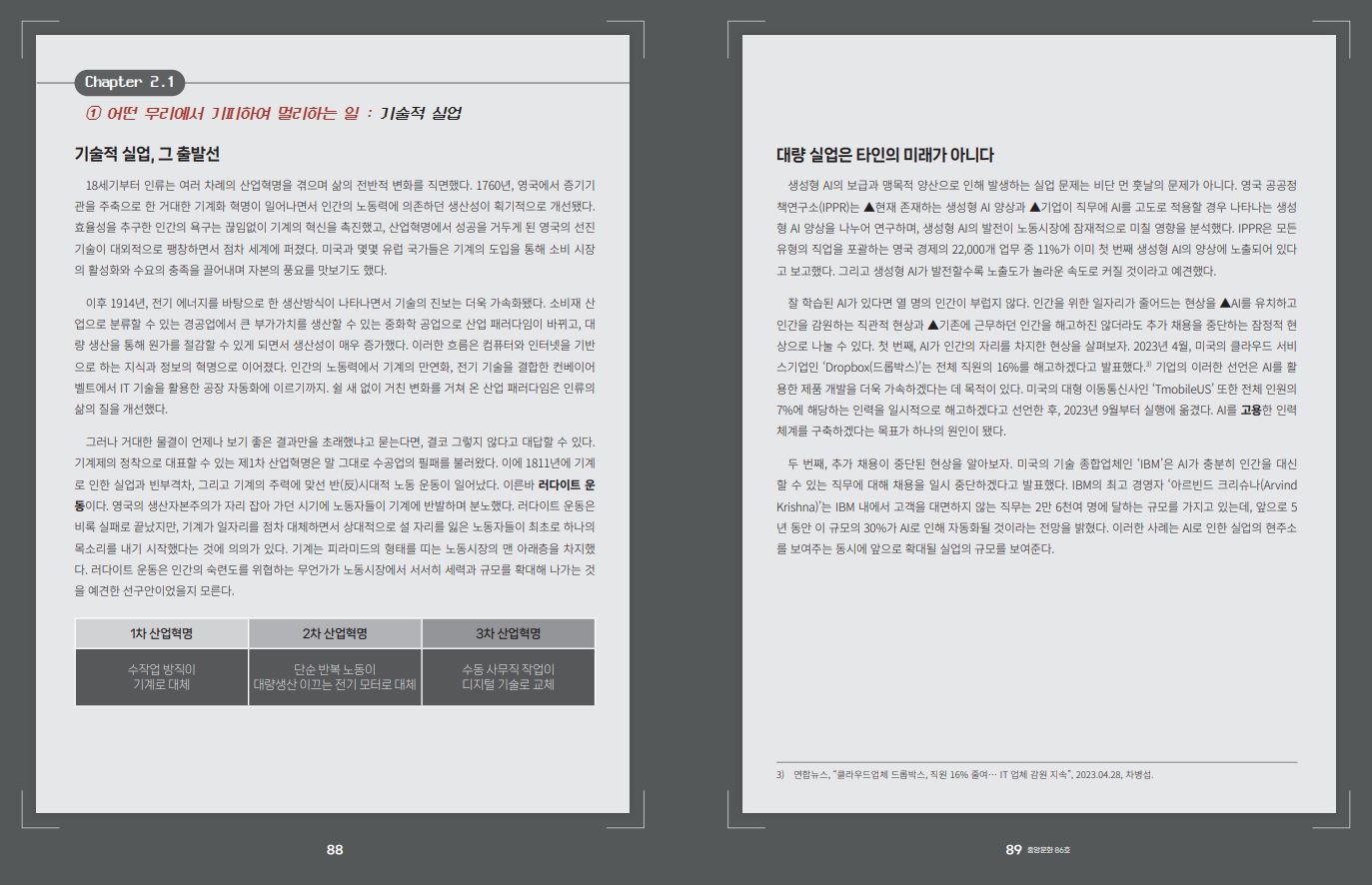 그러나 거대한 물결이 언제나 보기 좋은 결과만을 초래했냐고 묻는다면, 결코 그렇지 않다고 대답할 수 있다. 기계제의 정착으로 대표할 수 있는 제1차 산업혁명은 말 그대로 수공업의 필패를 불러왔다. 이에 1811년에 기계로 인한 실업과 빈부격차, 그리고 기계의 주력에 맞선 반(反)시대적 노동 운동이 일어났다. 이른바 러다이트 운동이다. 영국의 생산자본주의가 자리 잡아 가던 시기에 노동자들이 기계에 반발하며 분노했다. 러다이트 운동은 비록 실패로 끝났지만, 기계가 일자리를 점차 대체하면서 상대적으로 설 자리를 잃은 노동자들이 최초로 하나의 목소리를 내기 시작했다는 것에 의의가 있다. 기계는 피라미드의 형태를 띠는 노동시장의 맨 아래층을 차지했다. 러다이트 운동은 인간의 숙련도를 위협하는 무언가가 노동시장에서 서서히 세력과 규모를 확대해 나가는 것을 예견한 선구안이었을지 모른다.