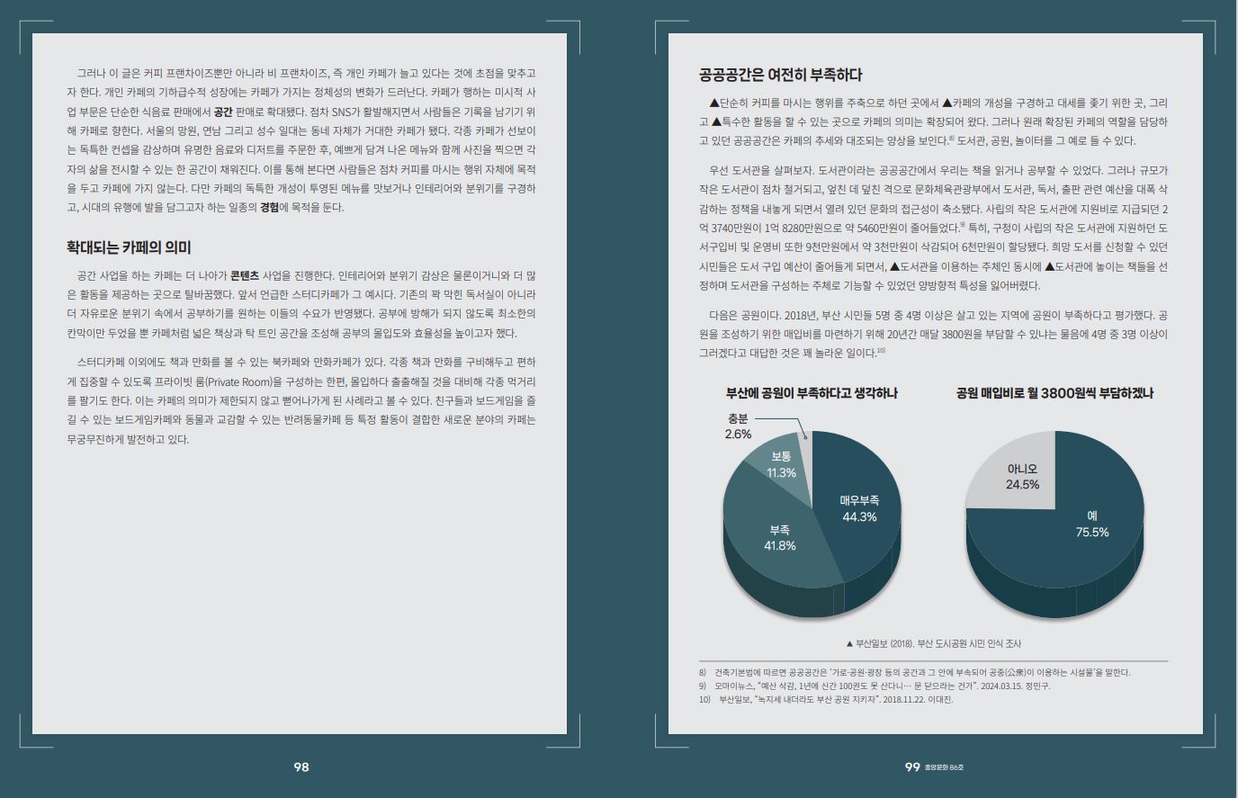 ▲단순히 커피를 마시는 행위를 주축으로 하던 곳에서 ▲카페의 개성을 구경하고 대세를 좇기 위한 곳, 그리고 ▲특수한 활동을 할 수 있는 곳으로 카페의 의미는 확장되어 왔다. 그러나 원래 확장된 카페의 역할을 담당하고 있던 공공공간은 카페의 추세와 대조되는 양상을 보인다.8 도서관, 공원, 놀이터를 그 예로 들 수 있다.