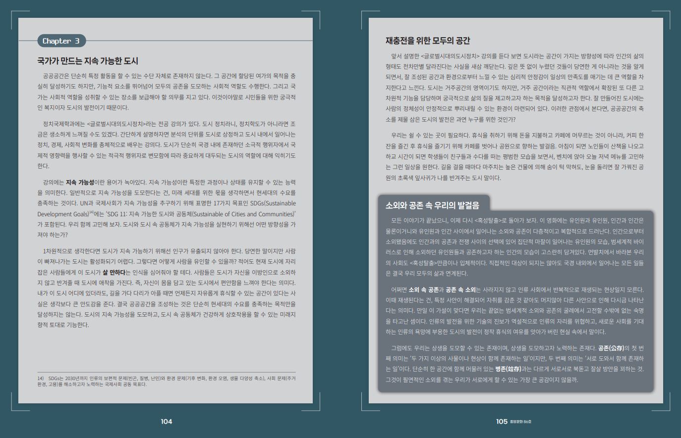 강의에는 지속 가능성이란 용어가 녹아있다. 지속 가능성이란 특정한 과정이나 상태를 유지할 수 있는 능력을 의미한다. 일반적으로 지속 가능성을 도모한다는 건, 미래 세대를 위한 몫을 생각하면서 현세대의 수요를 충족하는 것이다. UN과 국제사회가 지속 가능성을 추구하기 위해 표명한 17가지 목표인 SDGs(Sustainable Development Goals)14에는 ‘SDG 11: 지속 가능한 도시와 공동체(Sustainable of Cities and Communities)’가 포함된다. 우리 함께 고민해 보자. 도시와 도시 속 공동체가 지속 가능성을 실현하기 위해선 어떤 방향성을 가져야 하는가?