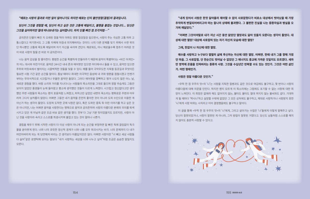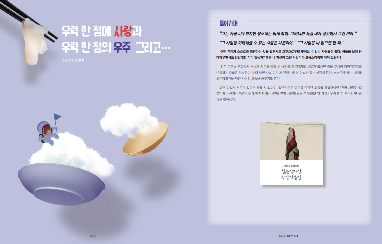 이 글을 통해 <우럭 한 점 우주의 맛>의 ‘나’에게, 그리고 살아가는 수많은 ‘나’들에게 이렇게 말해주고 싶다. 당신이 잘못되었거나, 사랑이 잘못된 게 아니라, 그저 방법이 잘못된 거였다고. 당신도 남들처럼 스스로를 해치지 않아도 충분히 사랑할 수 있다고.