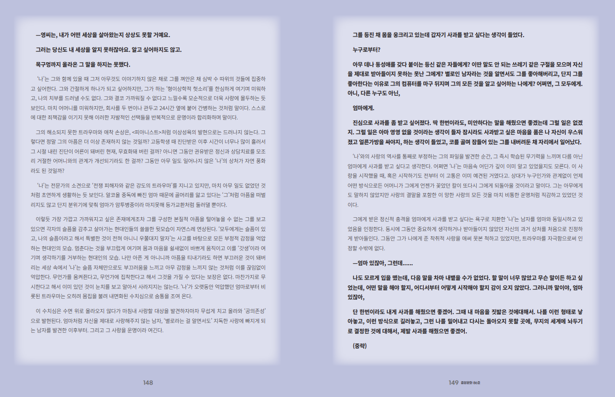 ‘나’는 전문가의 소견으로 ‘전쟁 피해자와 같은 강도의 트라우마’를 지니고 있지만, 마치 아무 일도 없었던 것처럼 초연하게 생활하는 듯 보인다. 알코올 중독에 빠진 엄마 때문에 골머리를 앓고 있다는 ‘그’처럼 아픔을 떠벌리지도 않고 단지 분위기에 맞춰 엄마가 암투병중이라 마지못해 등가교환처럼 둘러댈 뿐이다.