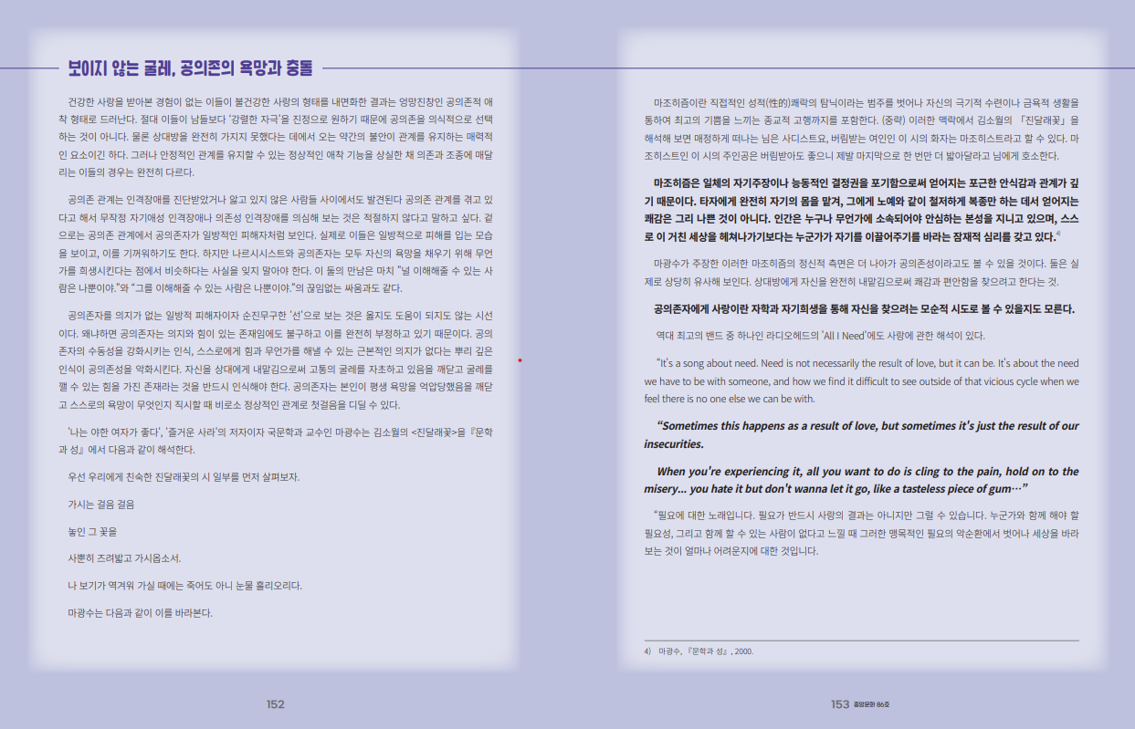 공의존은 단물이 빠진 지 오래된 껌을 턱이 아파도 영영 질겅질겅 씹으면서, 사랑이 주는 극심한 고통 따위 고통스럽다고 여기면서도 그 고통 자체에 마침내 의지해버리는 것이다. 나의 다른 문제를 잊기 위해서 수면 위의 단 하나뿐인 고통에 죽도록 매달리며 자기 자신을 속이며 견딘다. 해로워도, 아니 해로울수록 멈추기 어려운 것이 바로 사랑의 탈을 쓴 바로 이 공의존이다.