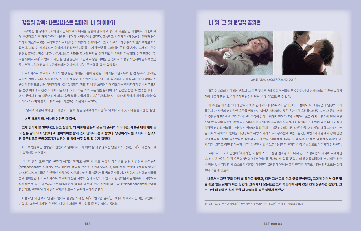 <피아니스트>의 결말에 ‘에리카’는 가슴에 스스로 칼을 찔러넣고 또다시 집으로 향하면서 비극이 극대화된다. 하지만 <우럭 한 점 우주의 맛>의 ‘나’는 ‘엄마를 용서할 수 없을 것 같다’며 운명을 되풀이하는 자해적 선택을 하는 것을 거부한 채 스스로의 감정을 마주한다. 5년만에 날아온 그의 편지를 계기로 ‘나’는 한편으로는 성장했다고 볼 수 있을까.