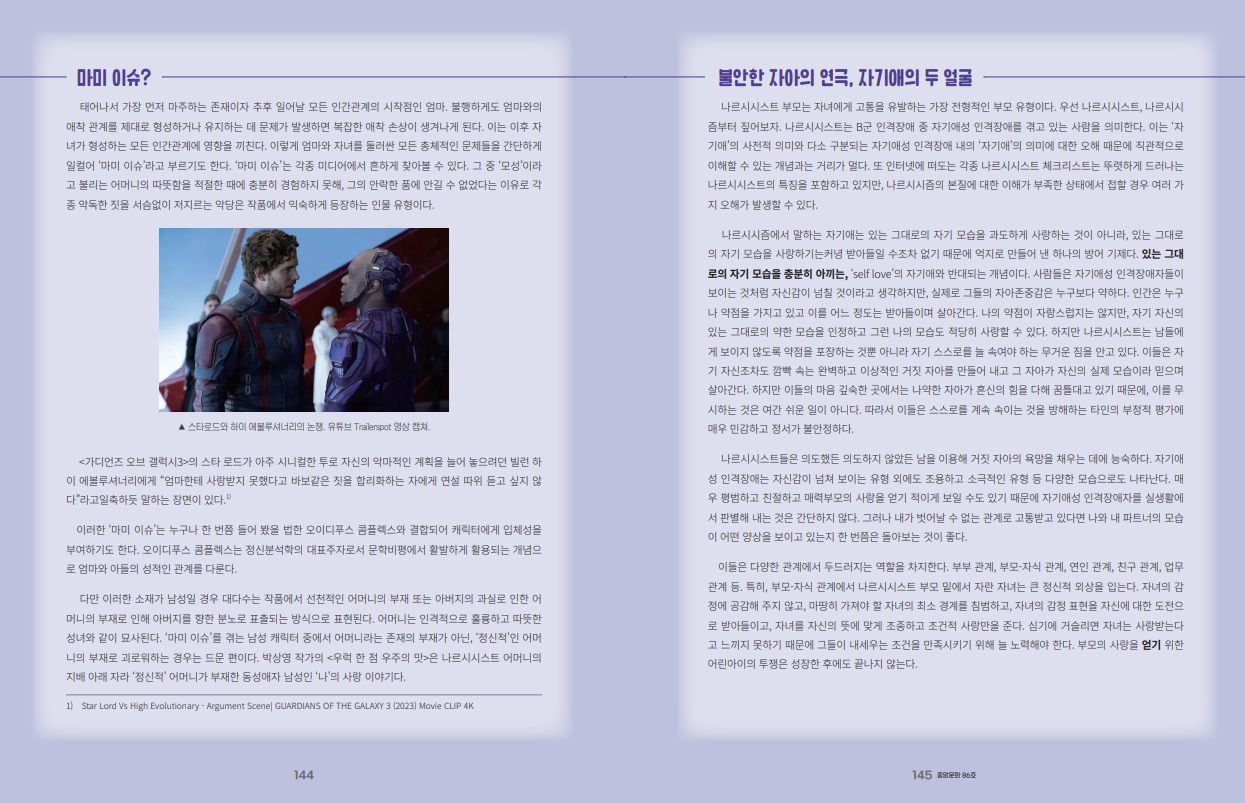 <가디언즈 오브 갤럭시3>의 스타 로드가 아주 시니컬한 투로 자신의 악마적인 계획을 늘어놓으려던 빌런 하이 에볼루셔너리에게 “엄마한테 사랑받지 못했다고 바보 같은 짓을 합리화하는 자에게 연설 따위 듣고 싶지 않다”라고 일축하듯 말하는 장면이 있다.