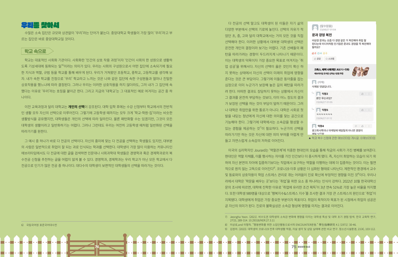 이전 교육과정과 달리 대학교는 개인의 선택이 강조된다. 대학 입학 후에는 수강 신청부터 학교에서의 전반적인 생활 모두 자신의 선택으로 이루어진다. 그렇기에 고등학생 때까지는 모두 크게 '학교-학원-집'이라는 비슷한 생활방식을 공유했지만, 대학생들은 개인의 선택에 따라 달라진다. 물론 패턴화할 수는 있겠지만, 그것이 모든 대학생의 생활이라고 일반화하기는 어렵다. 그러나 그런데도 우리는 여전히 고등학생 때처럼 일반화된 선택을 따라가기를 원한다.