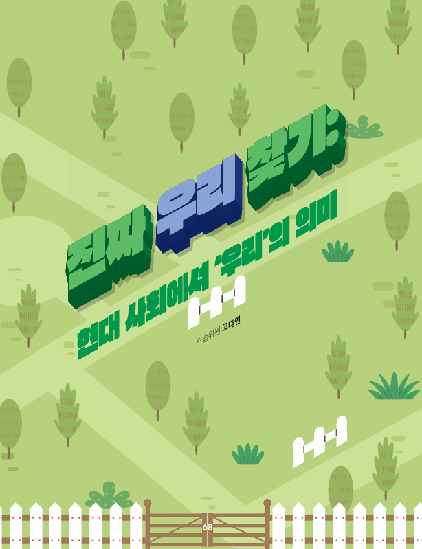 그렇다면 현대인들은 왜 소속감보다는 '소속'에 집중을 하는 것일까. 어떠한 지위에 집중해 뜻을 설명하는 '우리'의 사전적 의미는 더 이상 우리를 온전히 담아내지 못한다. 현대사회의 소속과 소속감, 그리고 나아가 진짜 우리의 의미가 무엇인지 찾아보자.