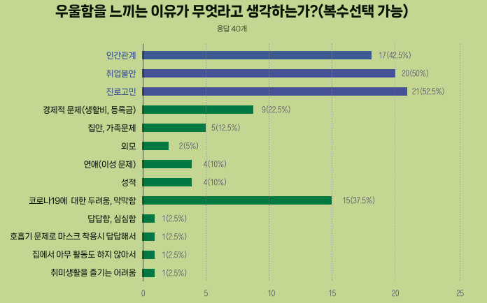 우리와 지위 사이에서 생긴 의문과 함께 우리가 직접 ‘우리’라고 칭하는 집단 중 많은 집단이 소속감보다는 내 몸이 속해 있는 ‘소속’ 자체에 집중된 것 같다고 생각했다. 필자부터도 대한민국을 우리나라, 중앙대학교를 우리 학교라고 칭하지만 쉽게 ‘우리’라는 수식어를 붙이는 것에 비해 이 집단에서 느끼는 소속감 자체는 크지 않다고 느낀다. 특히 코로나 이후 ‘언택트 사회’가 강조되며 ‘사람과의 접촉을 최소화하는 비대면 방식을 선호하는 사회적, 경제적 현상’이 나타났다. 그 결과 전국 만20~65세 이하의 성인 남녀 1,031명을 대상으로 한 조사에서 전체 응답자의 40.7%가 코로나 블루를 경험했다는 응답으로 이어졌다. 이 중 ‘외출 및 모임 자제로 인한 사회적 고립감’이 32.1%로 가장 높게 나타났다.