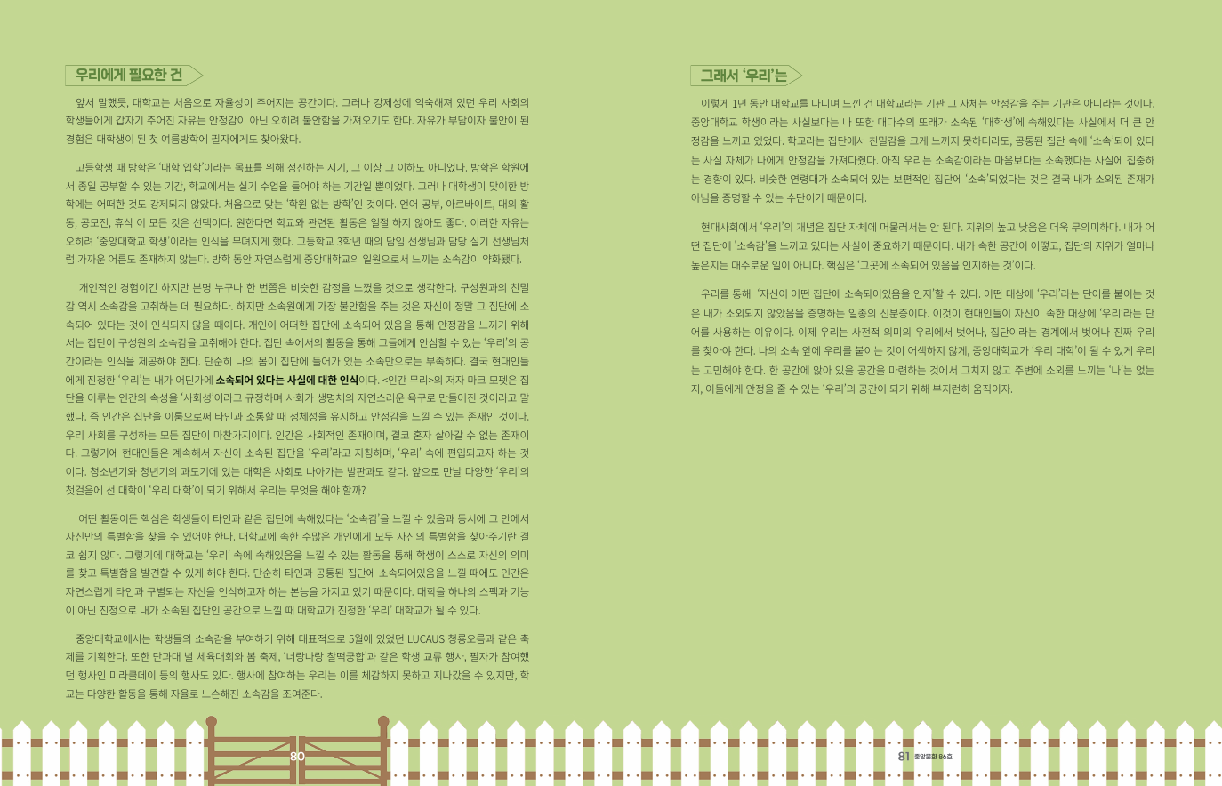 우리를 통해 '자신이 어떤 집단에 소속되어있음을 인지'할 수 있다. 어떤 대상에 '우리'라는 단어를 붙이는 것은 내가 소외되지 않았음을 증명하는 일종의 신분증이다. 이것이 현대인들이 자신이 속한 대상에 '우리'라는 단어를 사용하는 이유이다. 이제 우리는 사전적 의미의 우리에서 벗어나, 집단이라는 경계에서 벗어나 진짜 우리를 찾아야 한다. 나의 소속 앞에 우리를 붙이는 것이 어색하지 않게, 중앙대학교가 '우리 대학'이 될 수 있게 우리는 고민해야 한다. 한 공간에 앉아 있을 공간을 마련하는 것에서 그치지 않고 주변에 소외를 느끼는 '나'는 없는지, 이들에게 안정을 줄 수 있는 '우리'의 공간이 되기 위해 부지런히 움직이자.