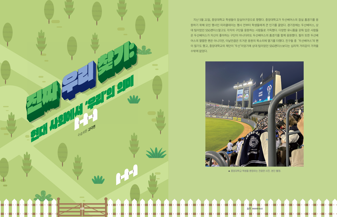 지난 5월 21일, 중앙대학교 학생들이 잠실야구장으로 향했다. 중앙대학교가 두산베어스의 잠실 홈경기를 응원하기 위해 모인 행사인 미라클데이는 행사 전부터 학생들에게 큰 인기를 끌었다. 경기장에는 두산베어스, 상대 팀이었던 SSG랜더스말고도 각자의 구단을 응원하는 사람들로 가득했다. 다양한 유니폼을 갖춰 입은 사람들은 두산베어스가 자신이 좋아하는 구단이 아니더라도 두산베어스의 홈경기를 함께 응원했다. 필자 또한 두산베어스의 열렬한 팬은 아니지만, 이날만큼은 뜨거운 응원의 목소리에 열기를 더했다. 친구들 중 '두산베어스'의 팬이 많기도 했고, 중앙대학교의 재단이 '두산'이었기에 상대 팀이었던 SSG랜더스보다는 심리적 거리감이 가까울 수밖에 없었다.