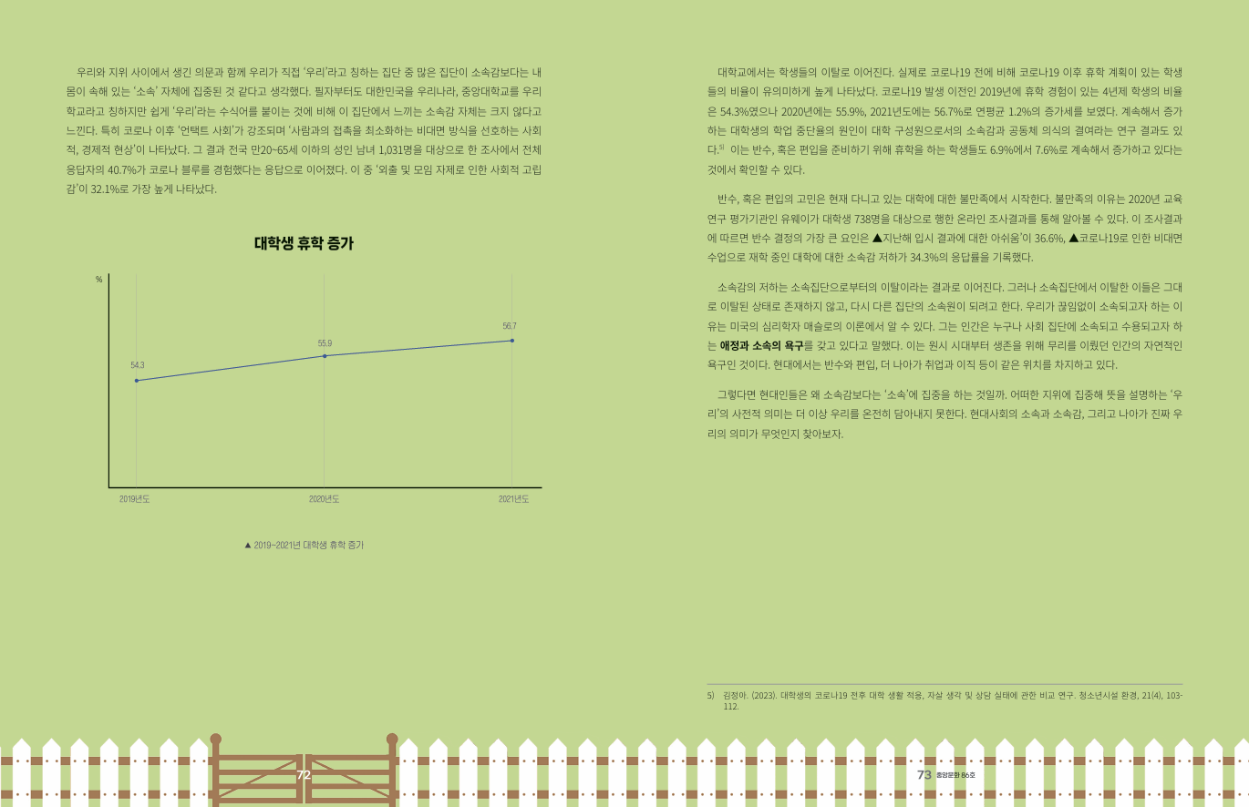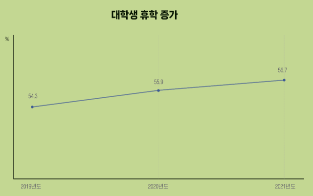 대학교에서는 학생들의 이탈로 이어진다. 실제로 코로나19 전에 비해 코로나19 이후 휴학 계획이 있는 학생들의 비율이 유의미하게 높게 나타났다. 코로나19 발생 이전인 2019년에 휴학 경험이 있는 4년제 학생의 비율은 54.3%였으나 2020년에는 55.9%, 2021년도에는 56.7%로 연평균 1.2%의 증가세를 보였다. 계속해서 증가하는 대학생의 학업 중단율의 원인이 대학 구성원으로서의 소속감과 공동체 의식의 결여라는 연구 결과도 있다.5 이는 반수, 혹은 편입을 준비하기 위해 휴학을 하는 학생들도 6.9%에서 7.6%로 계속해서 증가하고 있다는 것에서 확인할 수 있다.
