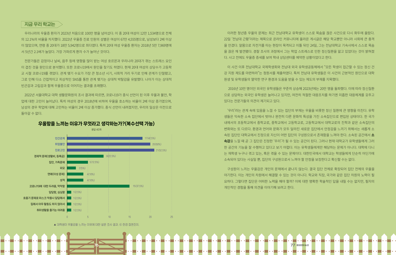 이러한 청년층 우울의 문제는 최근 전남대학교 유학생이 스스로 목숨을 끊은 사건으로 다시 화두에 올랐다. 22일 ‘전남대 근황’이라는 제목으로 온라인 커뮤니티에 올라온 게시글은 해당 학교뿐만 아니라 사회에 큰 충격을 안겼다. 알몸으로 자전거를 타는 현장이 목격되고 이틀 뒤인 24일, 그는 전남대학교 기숙사에서 스스로 목숨을 끊은 채 발견되었다. 경찰 조사의 과정에서 그는 학업 스트레스로 인한 정신질환을 앓고 있었다는 것이 밝혀졌다. 사고 전에도 우울증 증세를 보여 학내 상담센터를 예약한 상황이었다고 한다.