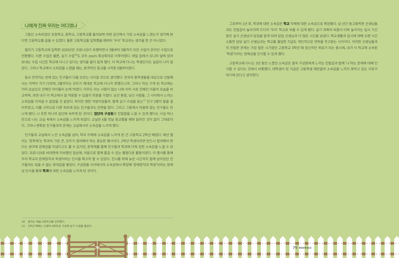 친구들과 교실에서 느낀 소속감을 넘어, 학과 자체에 소속감을 느끼게 된 건 고등학교 2학년 때였다. 매년 열리는 ‘문학제’는 학과의 가장 큰, 모두가 참여해야 하는 중요한 행사이다. 2학년 학생이라면 반드시 참여해야 한다는 생각에 강제성을 지녔다고도 볼 수 있지만, 문학제를 통해 친구들과 학과에 더욱 강한 소속감을 느낄 수 있었다. 코로나19로 비대면에 익숙했던 일상에, 처음으로 함께 즐길 수 있는 활동다운 활동이었다. 이 행사를 통해 우리 학교의 문예창작과 학생이라는 인식을 확고히 할 수 있었다. 전시를 위해 늦은 시간까지 함께 남아있던 친구들과도 잊을 수 없는 유대감을 쌓았다. 구성원들 사이에서의 소속감에서 확장해 '문예창작과 학생'이라는 정체성 인식을 통해 학과에 대한 소속감을 느끼게 된 것이다.