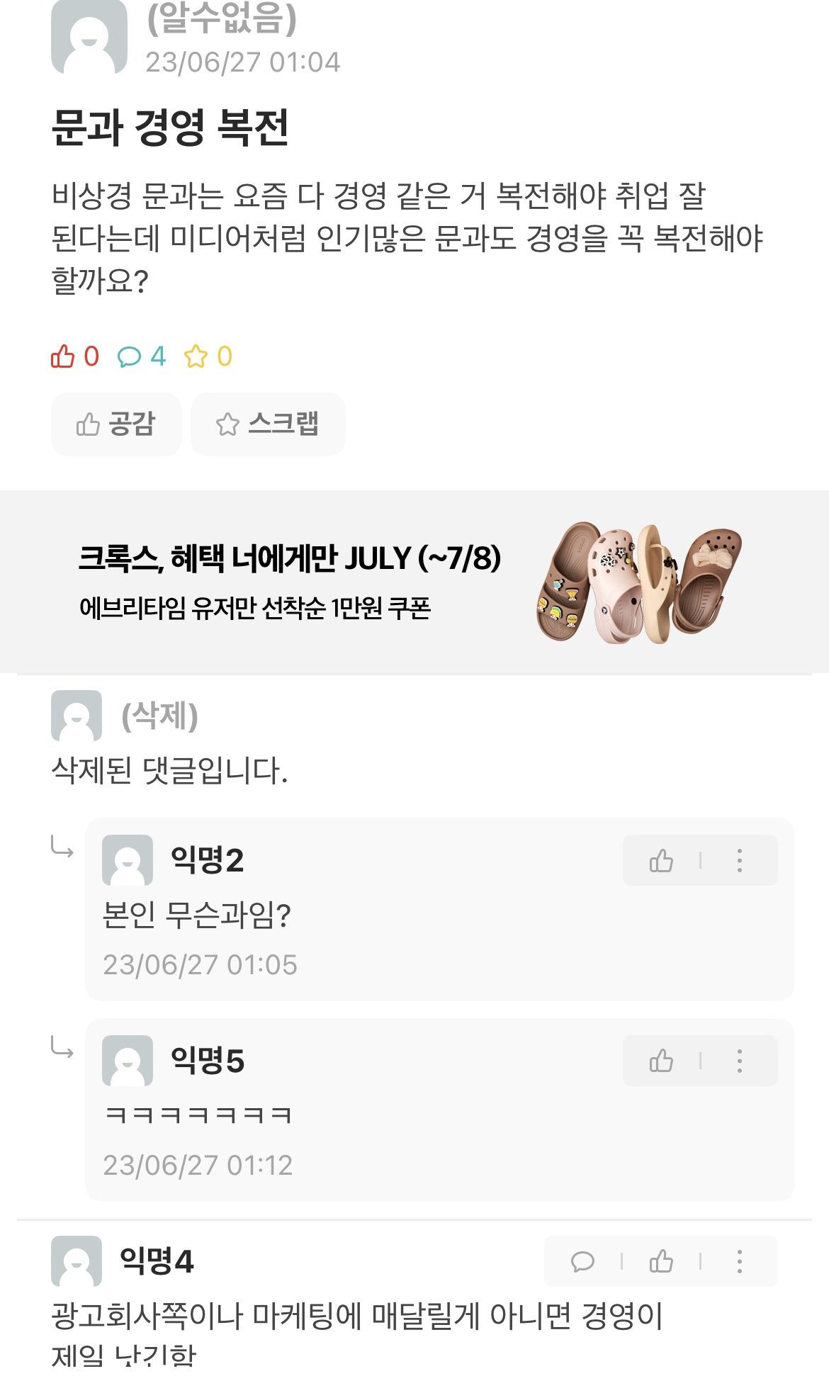 그 예시 중 하나가 바로 다 전공의 선택이다. 자신의 흥미에 맞는 다 전공을 선택하는 학생들도 있지만, 대부분의 사람은 일반적으로 취업이 잘 되는 과로 인식되는 학과를 선택한다. 대학생이 가장 많이 이용하는 커뮤니티인 에브리타임에서도 다 전공에 대한 글을 검색하면 인문대나 사회과학대 학생들은 경영학과 혹은 경제학과로의 복수전공 신청을 추천하는 글을 어렵지 않게 볼 수 있다. 경영학과, 경제학과는 우리 학교가 아닌 모든 학교에서 다 전공으로 인기가 많은 전공 중 하나이다. 대다수의 대학생이 보편적인 대학생들의 선택을 따라가는 것이다.