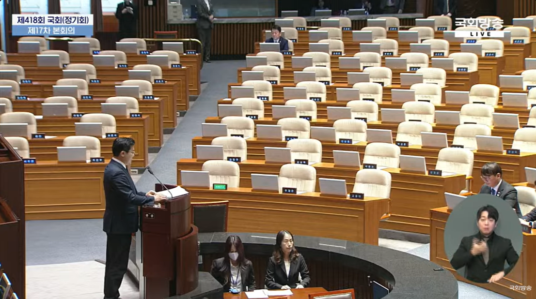 ‘김건희 특별법’이 통과된 이후 안철수 국회의원을 제외한 국민의힘 의원들은 본회의장을 빠져나가기 시작했다. 다음은 박찬대 의원의 제언설명 중 일부이다.