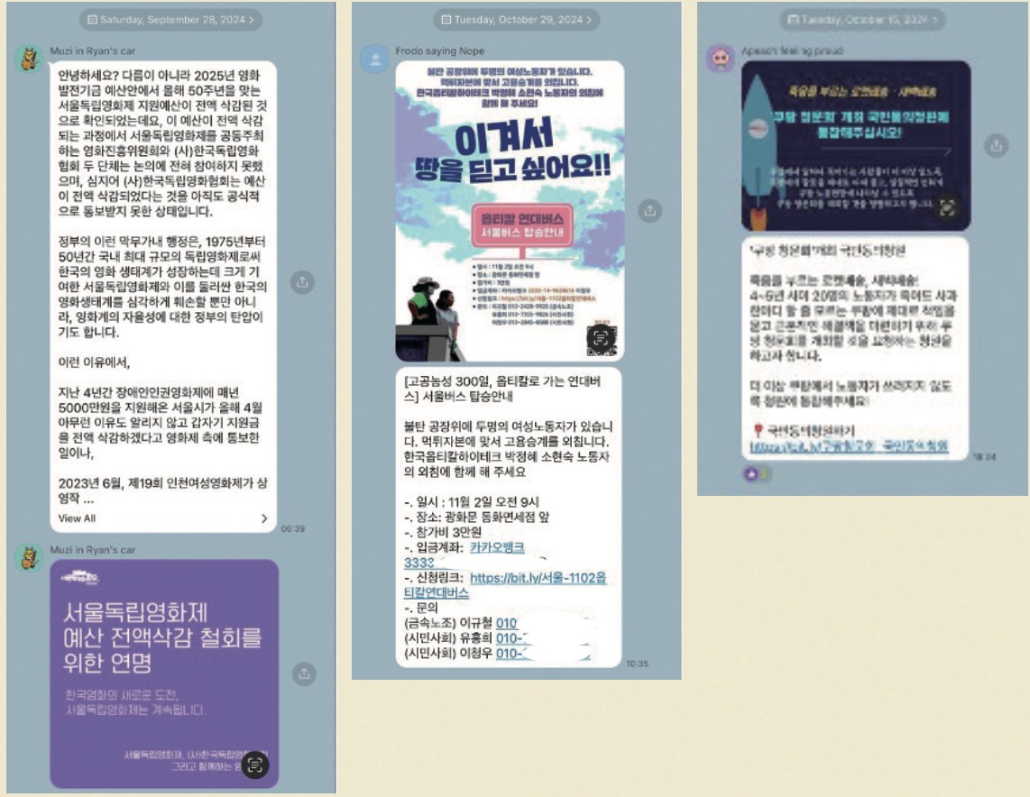다안: 가장 걱정이 되는 부분은 구성원들이 다 나이가 많고, 연차가 깊어요. 오래 활동을 하실 수 있는 분들이 정말 필요해요. 많은 사람들이 들어와 주셨으면 좋겠지만 권유하기에도 쉽지 않은 요즘입니다. 다양한 방면으로 거절을 많이 당하기가 쉬워요. 그게 쌓이면 사실 또 힘들어지기도 합니다. 그래서 또 한 번 단체의 역할이 중요하다고 생각합니다. 더해서 뭔가 보호가 될 수도 있고 아니면 그냥 이런 경험을 공유할 수도 있는 차원에서 보면 그런 것 같습니다.