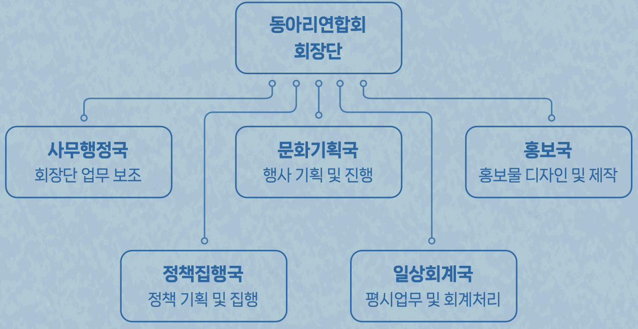 ▲ 중앙대학교 동아리연합회 조직도 [16] ⓒ중앙대학교 동아리연합회 Link 회장과 부회장은 회장단을 구성하며, 집행부의 경우 각 국의 국장을 의미한다. 전동대회가 열리지 않는 평시에는 동아리운영위원회(이하 동운위)가 최고 운영권을 가진다. 동아리 운영위원회는 회장단과 각 분과장으로 구성되며, 매달 2번 이상 정기회의를 통해 동아리 운영과 관한 전반 사항을 논한다. 분과장은 동아리운영위원회와 더불어 전학대회에도 참여하며, 산하 동아리들을 관리하는 중요한 위치다. 동아리연합회장단 선거와 분과장 선거가 같이 실시되는 이유이다.
