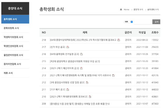 본론으로 들어가기 전, 이 글을 읽는 중앙대 재학생에게 질문을 던지고자 한다. 당신은 <중대중심>이라는 웹사이트를 알고 있는가? 형식상 재학생이든 외부인이든 상관없이 가장 쉽게 중앙대학교 총학생회를 확인할 수 있는 방법이 바로 <중대중심> 웹사이트를 방문하여 확인하는 것이다.5회의록 등 일반 재학생이 접근하기 쉽고 많은 이들이 알고자 하는 정보는 게재된 상황이다. 다만 부분적으로 해당 게시글의 마지막 수정 일자가 2021년, 혹은 2022년 수준에서 멈춰 있는 것을 확인할 수 있다. <중대중심> 웹사이트의 원활한 운영과 관련한 문의는 전학대회에서도 나타났다. 기술적인 오류가 잦아 학생들이 <중대중심>에서 총학 내부에서 논의된 다양한 회의안에 접근하는 데에 종종 제한이 있다. 이에 대한 개선 방안과 실제 예산 편성에 관해 질의가 있었다. 하지만 웹사이트의 전반적인 수정(혹은 개혁)에는 막대한 예산이 필요해 쉽사리 수정 및 전환이 어렵다는 답변이 되돌아왔다.