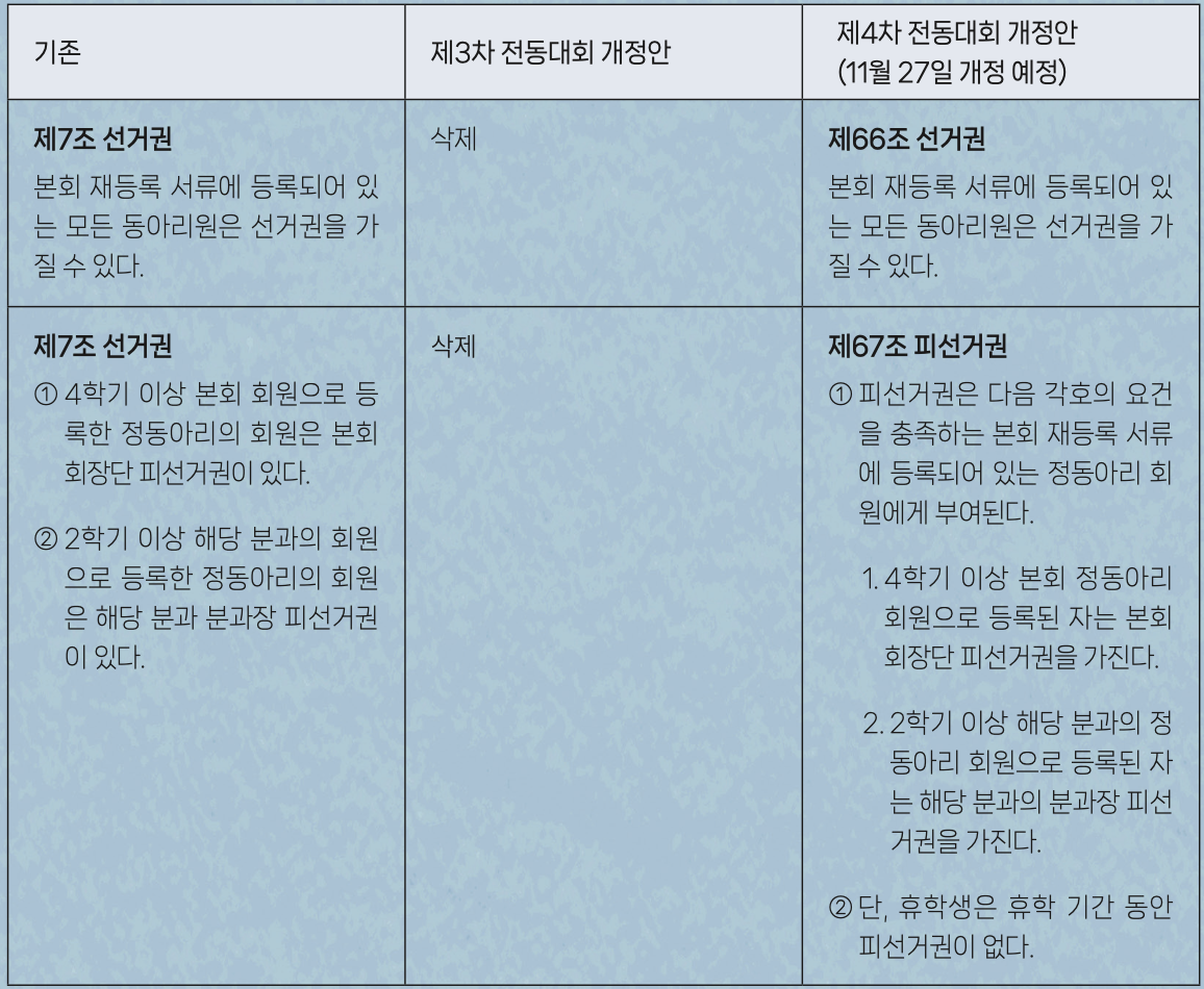 ②본 회칙에 기재되지 않은 사항은총학생회 회칙과관례 및 상식을 참조하여 의결기구의 의결을 통하여 결정한다.한편, 제3차 전동대회에서 선거권과 피선거권에 대한 조항이 삭제되기도 했다. 하지만 선거권·피선거권 조항이 삭제될 경우, 선거시행세칙의 정당성을 입증하기 어려워지게 된다. 세칙의 내용들은 회칙들로부터 나오기 때문이다. 동아리연합회는 해당 의견을 반영하여 오는 11월 27일에 이루어질 제4차 전동대회에서 다시 선거권·피선거권 조항을 추가할 예정이다. 이처럼 논의와 토론을 통해 기존과 다른 의견을 수정하여 더 좋은 길로 나아가기 위한 학생들의 노력은 사회의 구성원으로서 본받을 필요가 있다.