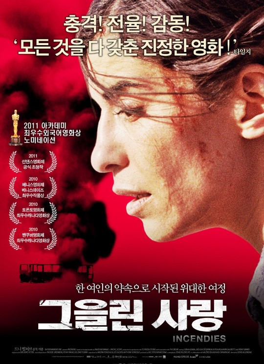 영화 <그을린 사랑> (드니 빌뇌브 감독, 2011년 개봉작)은 절대적인 수학 공식으로 설명할 수 없는 전쟁의 기구함과 벼랑 끝에 남겨진 피해자들의 비극을 다루고 있다. 이 영화에서 다루는 대부분의 사건들은 레바논 내전을 배경으로 한다. 영화를 보는 내내 벌어지는 비현실적이고 끔찍한 전쟁의 모습은 지금 우리의 삶과는 너무 거리가 멀어 이질감까지 느껴진다. 그런데, 놀랍게도 일어나고 있다. 그 끔찍한 일이 우리와 멀지 않은 지구 한 쪽에서 벌어지고 있다. 어쩌면 실제 현실은 영화보다 더 영화 같기도 하다.