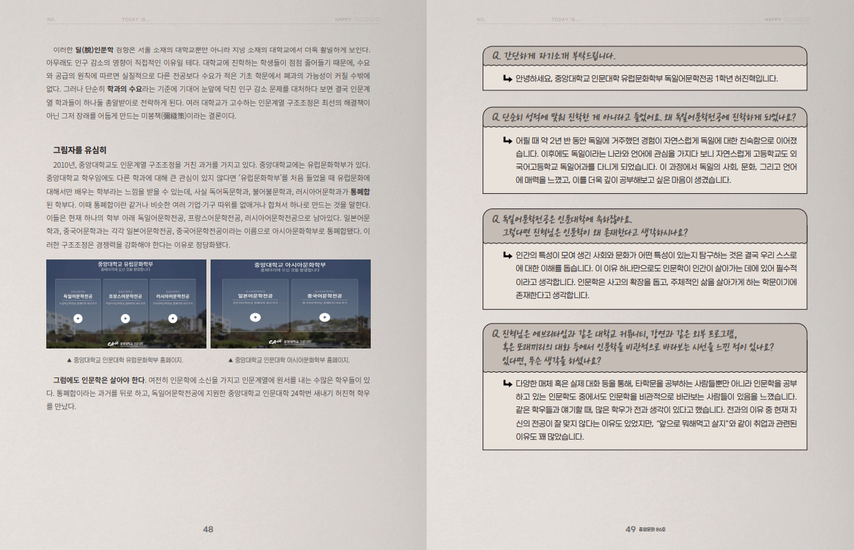 그럼에도 인문학은 살아야 한다. 여전히 인문학에 소신을 가지고 인문계열에 원서를 내는 수많은 학우들이 있다. 통폐합이라는 과거를 뒤로 하고, 독일어문학전공에 지원한 중앙대학교 인문대학 24학번 새내기 허진혁 학우를 만났다.