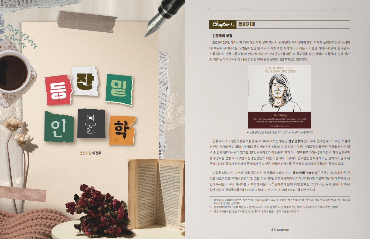 한강 작가가 일으킨 문학의 재조명은 사막 속 오아시스와 같은 파급력을 지니고 있다. 앞서 제시한 수치를 보더라도 현대사회에서 독서의 영향력은 현저히 줄어들었다. 과로로 녹초가 된 사람들은 글자 한 자, 문장 한 줄 읽는 것이 부담스럽다. 점점 줄어가는 독서 인구와 맞물려 출판업계도 고요해진 작업 현장을 피할 수 없었는데, 급격히 늘어난 독서에 대한 관심은 드디어 시들어가는 인문학이 부활한다는 여론을 몰고 오기도 했다. 잠깐, 인문학의 부활이라니?