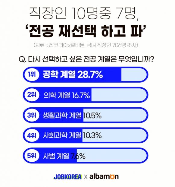 잡코리아와 알바몬이 4년제 대학교를 졸업한 직장인 706명을 대상으로 전공 만족도 조사를 진행했다. ‘본인의 전공에 만족하는가?’라는 질문에 78.0%가 불만족한다고 답했다. ▲ 만족한다는 답변은 16%, ▲ 잘 모르겠다는 답변은 6%에 그쳤다. 이때 불만족한다고 말한 전공은 ▲ 법학이 84.6%, ▲ 인문학이 83.9%를 차지했다. 그렇다면 이들이 재선택한 전공은 무엇일까? 1위는 28.7%를 차지한 공학 계열, 그 뒤는 의학 계열이 16.7%를 차지했다. 모두 취업이 잘 된다고 알려진 전공이다.