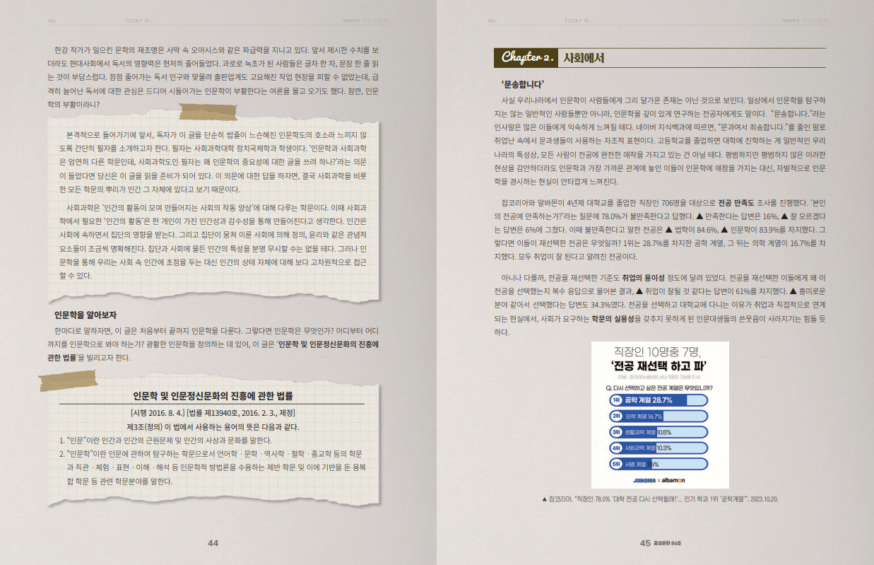사실 우리나라에서 인문학이 사람들에게 그리 달가운 존재는 아닌 것으로 보인다. 일상에서 인문학을 탐구하지는 않는 일반적인 사람들뿐만 아니라, 인문학을 깊이 있게 연구하는 전공자에게도 말이다. “문송합니다.”라는 인사말은 많은 이들에게 익숙하게 느껴질 테다. 네이버 지식백과에 따르면, “문과여서 죄송합니다.”를 줄인 말로 취업난 속에서 문과생들이 사용하는 자조적 표현이다. 고등학교를 졸업하면 대학에 진학하는 게 일반적인 우리나라의 특성상, 모든 사람이 전공에 완전한 애착을 가지고 있는 건 아닐 테다. 평범하지만 평범하지 않은 이러한 현상을 감안하더라도 인문학과 가장 가까운 관계에 놓인 이들이 인문학에 애정을 가지는 대신, 자발적으로 인문학을 경시하는 현실이 안타깝게 느껴진다.