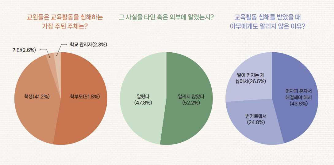 2018년 한국교육개발원의 교육활동 침해 실태 분석 결과보고서의 설문조사에 따르면, 교원들은 교육활동을 침해하는 가장 주된 주체에 대해 ▲ 학부모(51.8%) ▲ 학생(41.2%) ▲ 기타(2.6%) ▲ 학교 관리자(2.3%) 등의 순서로 응답했다. 교육활동에 있어 자유를 침해를 받았을 때 그 사실을 타인 혹은 외부에 알렸는지를 묻는 질문에서는 ‘알렸다’는 응답이 47.8%, ‘알리지 않았다’는 응답이 52.2%로 집계되었다. 교육활동 침해를 받았을 때 아무에게도 알리지 않은 이유로는 ▲ 어차피 혼자서 해결해야 해서(43.8%) ▲ ‘일이 커지는 게 싫어서(26.5%) ▲ 사안 처리를 위한 학교 행정절차가 번거로워서(24.8%)의 순서로 응답했다. 교육활동 침해를 받았을 때 본인의 치유를 위해 취한 조치에 관한 질문에는 ‘아무 조치도 취하지 못함’이라는 응답 비율(55.5%)이 가장 높았다.