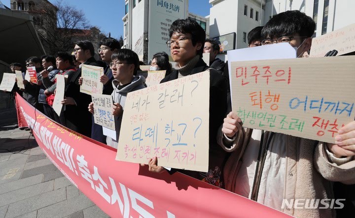 [각주:1]">▲지난 2월 20일 서울 중구 서울시의회 앞에 모여 서울학생인권조례 폐지 반대를 외치는 모습. ⓒ뉴시스 김진아. [각주:2]
