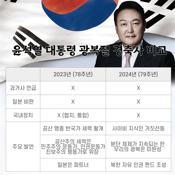 위 사진은 지난 윤석열 정부의 광복절 경축사를 과거사 언급, 일본 비판, 국내 정치, 주요 발언 측면에서 비교한 그래프를 보여준다. 특히 지난 광복절 경축사에서는 광복회와 독립운동 단체의 불참에 관해 어떠한 언급도 하지 않으며, 지도자로서 ‘협치와 설득’의 자질을 보여주기는커녕 오히려 그가 절대적인 믿음을 보여줬던 ‘가짜뉴스와 사이비 지식인들의 거짓 선동’에 대한 비난을 퍼붓기에 바빴다. 과연 허위 선동과 사이비 논란에 진정으로 휘둘렸던 이는 누구인가? 참고로 그는 계엄 전후로 위기를 맞을 때마다 강하게 편향된 정치 색채감을 드러내며 각종 음모론으로 분열을 일으키는 극우 유튜버들과 긴밀한 소통을 해왔다. 또한 자신과 대척점에 놓인 이들을 공산 전체주의를 맹종하는 반국가 세력들로 몰아세우며 과거 독재정권에서 세력화를 위해 주로 사용하던 이데올로기를 여과 없이 드러냈다. 그뿐만 아니라 김태효 국가안보실 제1차장의 ‘중요한 것은 일본의 마음’이라는 발언도 큰 화제가 되었다. 이에 대통령은 일본이 이미 수십 차례 사과했기 때문에 피로감이 쌓여 있다며 마치 짜증 내는 아이를 달래기 위해 단 사탕이 필요하다는 것과 같은 발언으로 국민의 애통과 분노에 기름을 가득 부었다. 그가 그렇게 강조하곤 했던 ‘국민의 뜻’에 5천만 명의 국민은 더 이상 포함되지 않았다.