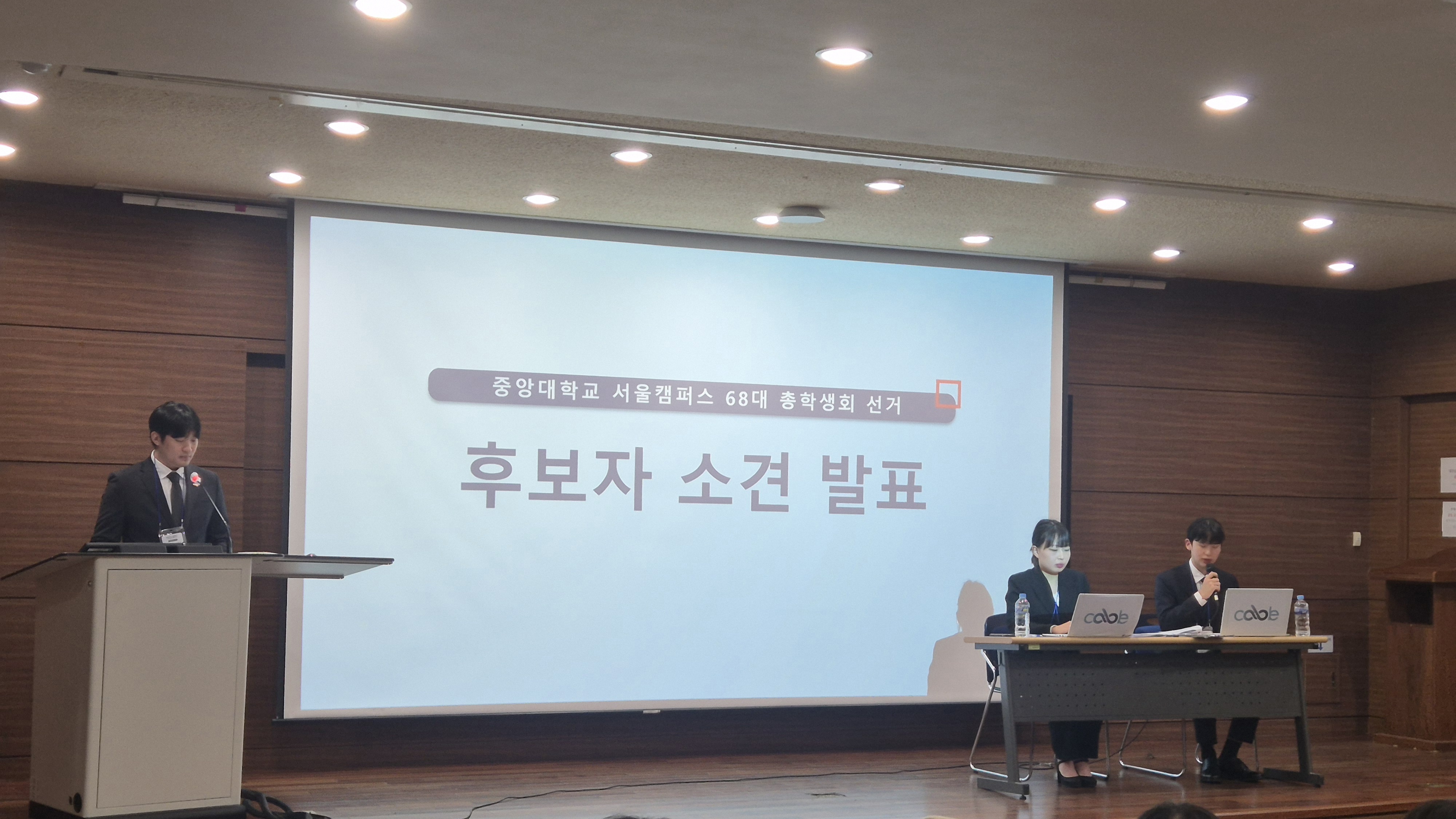 20일 19시, ‘중앙대학교 서울캠퍼스 68대 총학생회 선거 합동공청회’가 203관 207호 대강당에서 진행됐다. 이날 공청회는 ‘중앙대학교 서울캠퍼스 68대 중앙선거관리위원회’ SNS 라이브(인스타그램 @cau.vote)를 통해서도 동시에 중계됐다. 후보자와 선거운동본부 관계자, 학내 언론사 및 학생들이 참석했으며, 선거운동본부 ‘ca:ble’(이하 선본)의 핵심 공약과 실현 가능성을 확인하기 위한 질의가 이어졌다. 공청회는 후보자 소견 발표를 시작으로 학내 언론사 질의, 사전 제출 질문, 현장 질문 순으로 이어졌다.