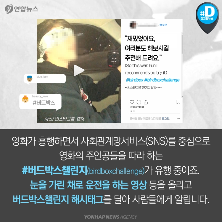 ▲ 실제 SNS에서 유행한 버드박스챌린지.  ©연합뉴스